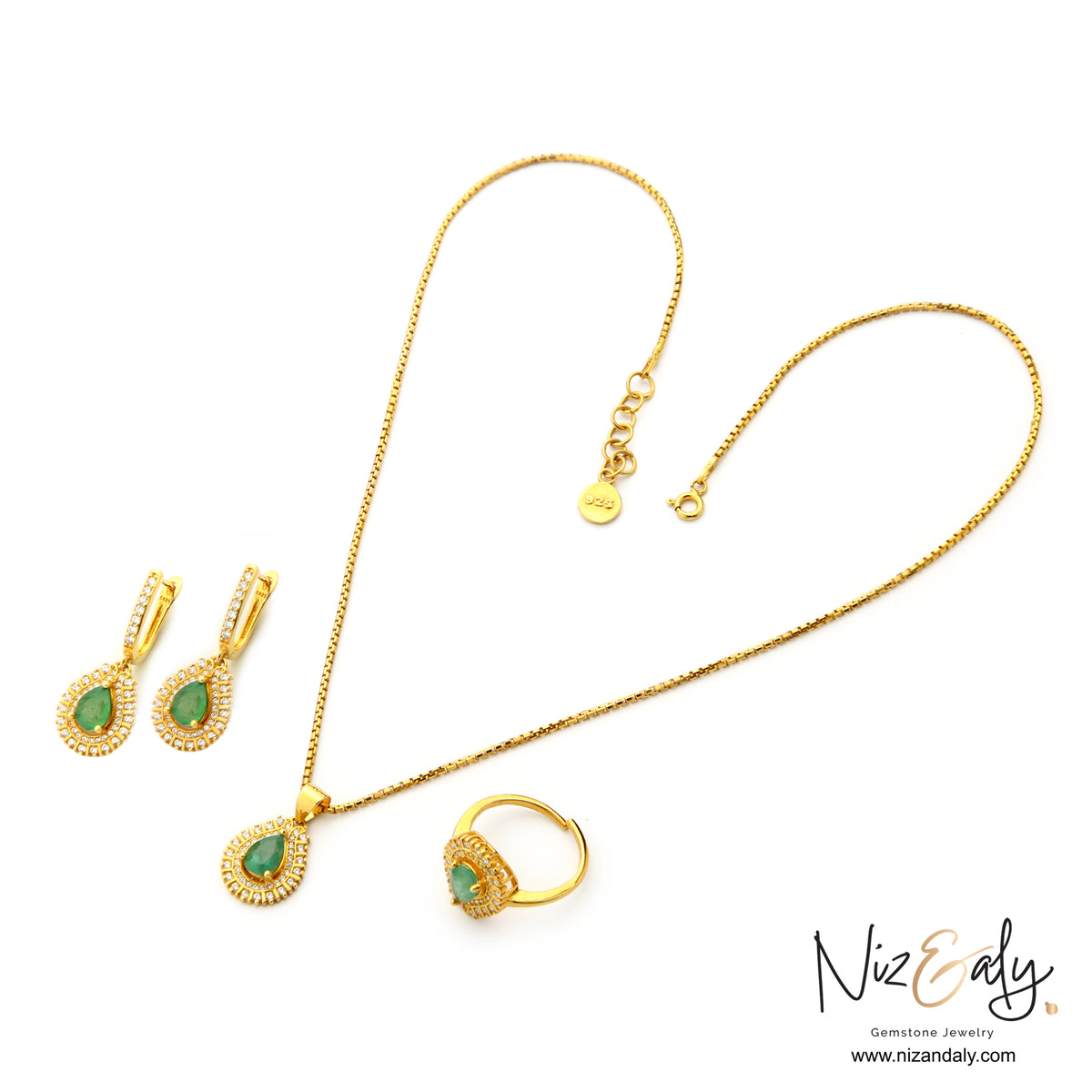 The Emerald Reverie Set embodies timeless elegance and the captivating allure of vivid green natural emeralds. Featuring a teardrop pendant necklace, matching earrings, and a statement ring, each emerald is faceted to reveal rich depths of color reminiscent of enchanted forests and secret gardens.
