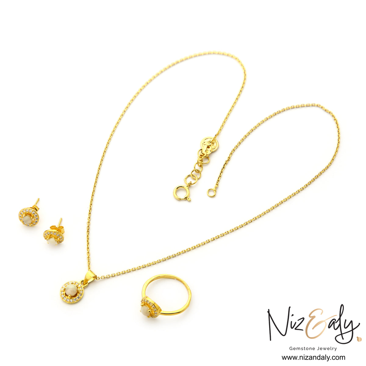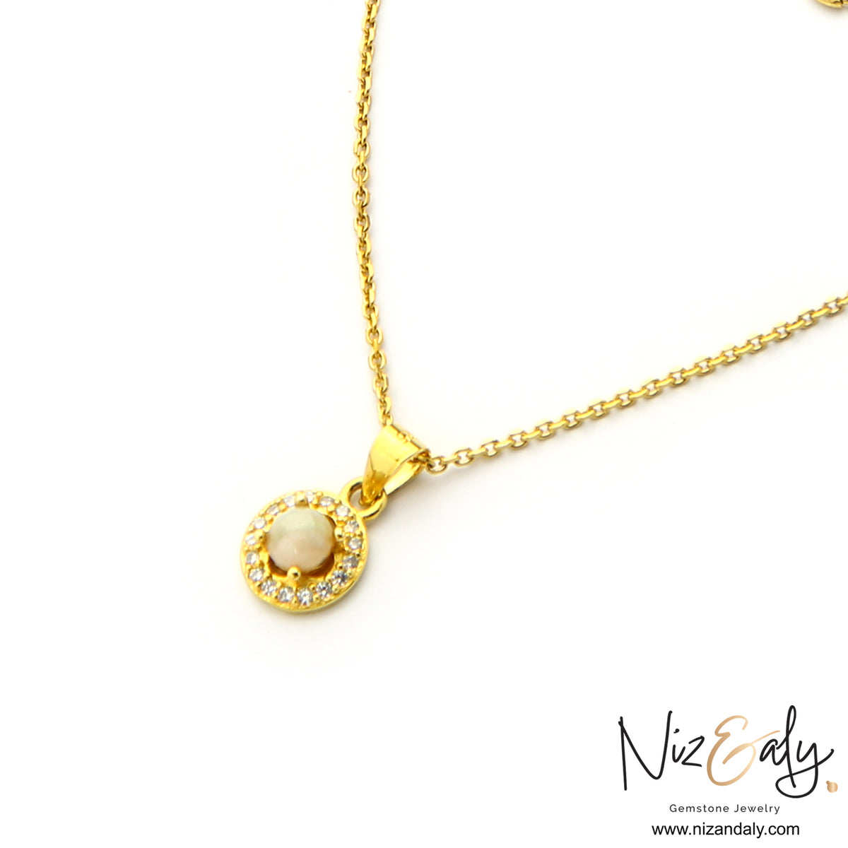 Each opal is encircled by a delicate halo of sparkling clear stones, enhancing its natural brilliance and adding a touch of graceful glamour. Designed to radiate warmth, love, and elegance, this set is perfect for those drawn to classic opal jewelry with enduring charm.