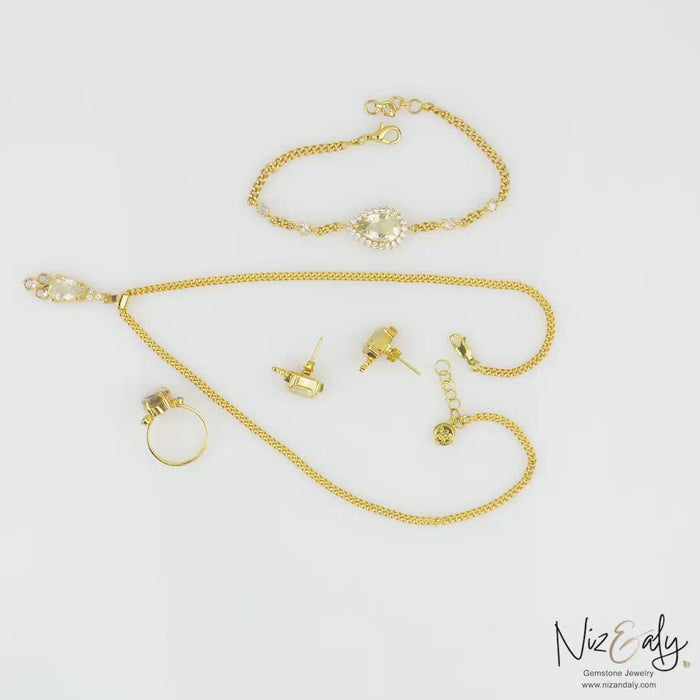 Elevate your elegance with the TearDrop Shaped Clear Quartz Pendant Set with Bracelet – Pure Essence. Crafted from AAA+ quality faceted teardrop-shaped Clear Quartz, this stunning set is beautifully complemented by a gold-plated 925 sterling silver setting. The set includes a pendant, bracelet, adjustable ring, and ear studs, all thoughtfully designed to enhance your natural radiance. With an approximate total stone carat weight of 7.0 ctw and a total product weight of 30.0 grams, each piece reflects premium craftsmanship and style. Clear Quartz, known as an alternate April birthstone, is celebrated for its ability to amplify focus, provide clarity in decision-making, and promote mental well-being. The pendant measures 1.35" by 0.37", the bracelet is 8" in length, the ear studs are 0.70" by 0.36", and the ring features an adjustable band with a 0.60" by 0.40" top. A 16" sterling silver chain is included, making this ensemble a timeless and meaningful addition to any jewelry collection.