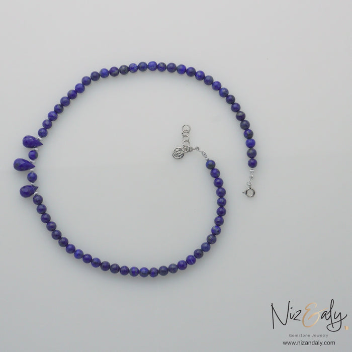 Three teardrops of midnight blue rest like fallen stars upon the collarbone — each one flecked with golden whispers, echoing ancient skies. The round beads, polished and deep, form a constellation of truth and intuition, guiding the wearer toward inner wisdom and serene expression.